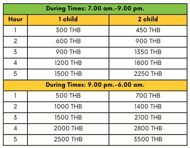 THB 500 per babysitter/nanny per day—includes access to: